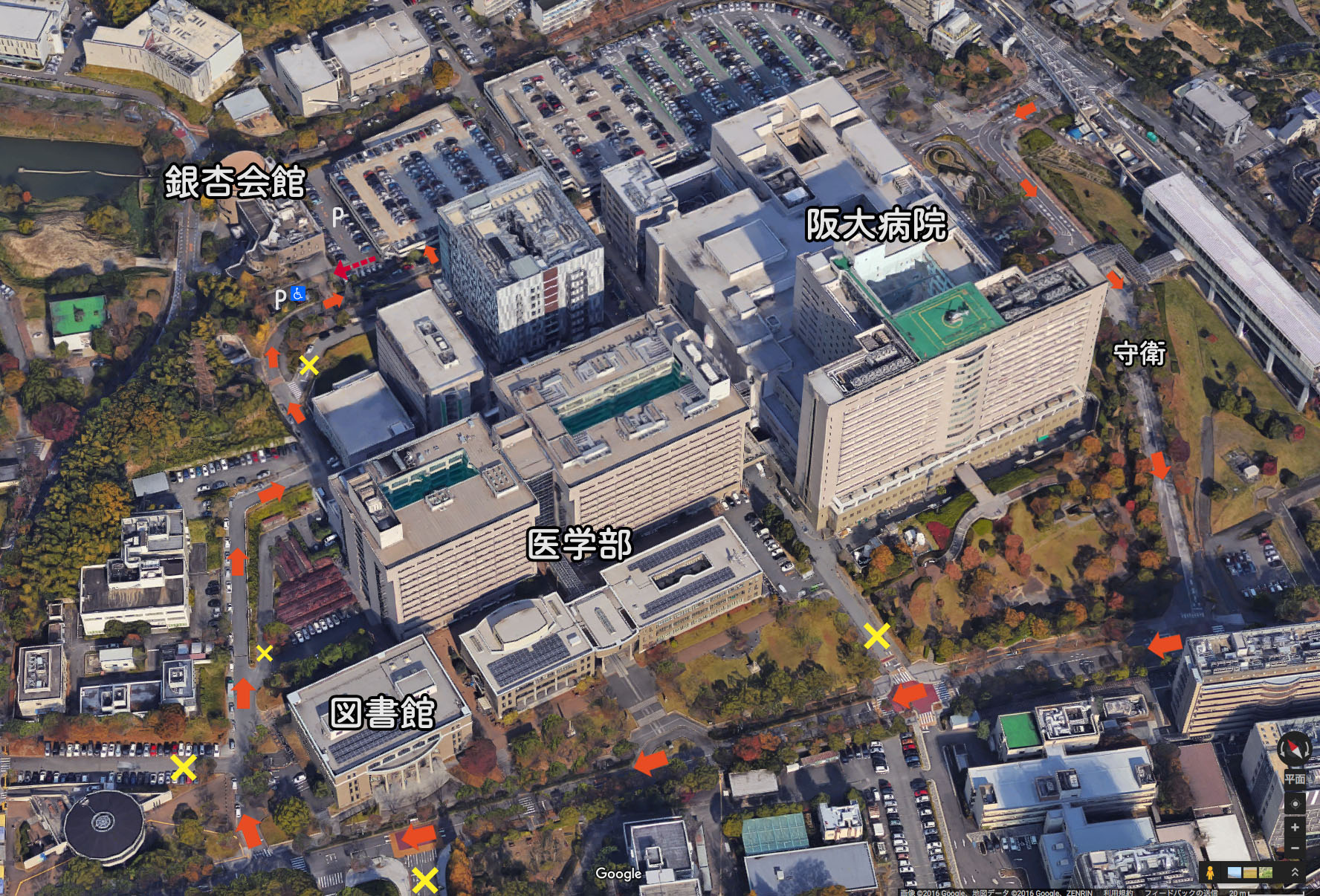 | 大阪モノレール「阪大病院前」より会場までの道案内(青線) |